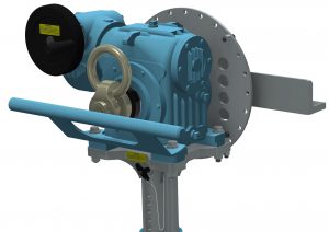 In lieu of a standard hand wheel, a battery powered rechargeable hand drill is mounted to the gearbox input shaft. This option includes an anti-rotation plate with set screws to lock the drill into place so that the technician simply squeezes the trigger to rotate the payload. With this option, easy crank torque is no longer relevant and the full torque rating of the gearbox can be utilized. This option includes a pre-set clutch (in addition to the clutch built into the hand drill) so that the technician doesn’t need to worry about over-torqueing the gearbox. If the payload torque exceeds the rated gearbox torque rating, then the user will hear a clicking sound when operating the hand drill and the payload will not rotate. This option is recommended if rotational duty cycles are high.