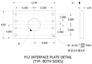 Mounting Plate Interface (P12) – The P12 mounting plate is 8″ x 12″ and has (quantity 8) thru holes on a 10.5″ x 6″ pattern (centered on the plate). The (quantity 8) thru holes will accept up to ½” diameter bolts. The standard finish is clear zinc plating.